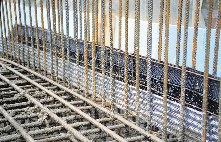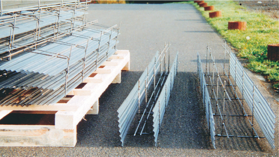 Das 3,0 m lange Fugenbandführungselement besteht aus 4 Fugenbandhaltern die durch 3 Längseisen fest miteinander verbunden sind. Die losen wellprofilierten Lochbleche werden an der aufgehenden Bewehrung befestigt. Das Fugenband wird bauseits in die Fugenbandhalter eingeführt und an den unteren und oberen Längseisen befestigt.