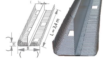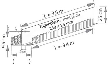 Standardelement, U-förmig gekantet aus wellprofiliertem Lochblech, Elementlänge 3,4 m, Elementbreite 15 cm, Aufkantungshöhe 9,5 cm, Fugenblech 250 mm/1,5 mm/3,5 m lang. Durch den im Radius gebogenen Eckbereich ergibt sich eine sehr hohe Stabilität, gleichzeitig erleichtert der gebogene Eckbereich das Rütteln unter dem Aufkantungselement.